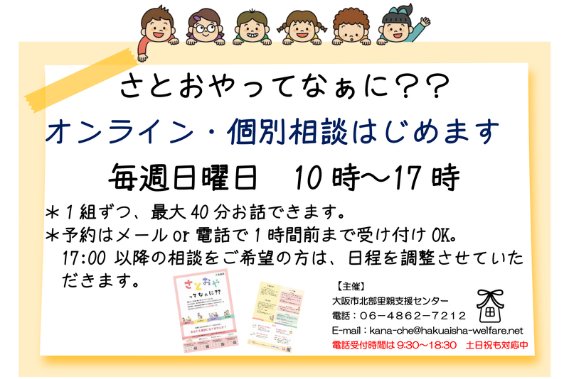お知らせ HOME お知らせ 大阪市北部里親支援センター お知らせ オンライン個別相談のお知らせ オンライン個別相談のお知らせ お知らせ2025.08.19 8月24日から、オンラインで個別相談始めます😊 日曜日限定での開催ですが、17時以降をご希望の場合は他の曜日でも調整できますので、お気軽にお問い合わせください♪